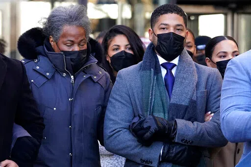 Actor Jussie Smollett, right, departs with his mother Janet, from the Leighton Criminal Courthouse, Wednesday, Dec. 8, 2021, in Chicago, after Cook County Judge James Linn gave the case to jury. (AP P...
